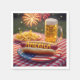 Um cachorro-quente com a palavra "América" na mostarda se senta em uma placa de bandeira patriótica, acompanhada de batatas fritas e uma caneca de cerveja em uma toalha de mesa vermelha e branca