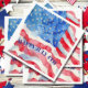 4 de julho, guardanapos de CHURRASCO com fundo vermelho branco e azul e as palavras Feliz 4 de julho