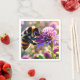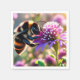 Uma abelha vibrante paira delicadamente sobre uma flor roxa florescente. O corpo listrado da abelha contrasta com as pétalas moles, destacando a beleza da polinização.
