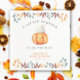 "Uma abóbora está a caminho. Celebrar com este filhote de abóbora de desenho animado temido para festa de chá de fraldas! Bomba de desenho agudo kawaii, de cor aquosa, com chapéu de outono (boné) e folhas de outono. No verso do cartão estão as folhas do outono.