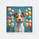 Um cachorro fofo adornado com uma coroa de flores desfruta de uma festa de aniversário vibrante com bolos coloridos, balões e condecorações alegres, evocando alegria e celebração em uma atmosfera festiva.