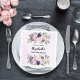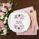 Um fundo violeta de cor aquosa. Personalize e adicione uma data, nome e idade. O texto: Os nomes são escritos em ouro rosa escuro com um moderno estilo escrito à mão. Decorados com flores impermeáveis, rosas cor-de-rosa, lavanda e roxo.