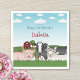 A ilustração original do desenho animado de Destei dos animais de exploração. Há uma vaca preta e branca, um porco rosa, duas galinhas e uma ovelha. Ao fundo há um celeiro vermelho com uma árvore e alguns feno colocados em colinas verdes de pastagem. O céu é azul com algumas nuvens. Há também duas áreas de texto personalizáveis.