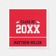 Este guardanapo de papel vermelho, preto e branco diz 'Classe de 2023' em texto grande. (Você pode mudar o ano se precisar.) Na parte inferior, há texto preto que você pode alterar para mostrar o nome correto para o formando. Os bonés brancos estão de ambos os lados da frase "Classe de".