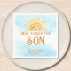 Você está planejando o chá de fraldas de um menino? Este guardanapo de papel chá de fraldas, com temática solar, é decorado com uma aquarela sorridente e tipografia na moda num fundo azul-céu. Facilmente personalizável. Original Watercolor © Michele Davies.