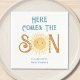 Estes guardanapos de papel de chá de fraldas apresentam o texto "Here Comes The Son" em tipografia azul-na moda e marrom com um sol sorridente de cor amarela e gira. Facilmente personalizável. Original Watercolor © Michele Davies.