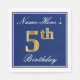 Este simples e elegante design de guardanapo de papel apresenta uma mensagem como "Aniversário do 5 do Nome-Aqui" (com o "5" a ter uma coloração falsa em ouro) dentro de uma área quadrada de cor azul com um contorno de fronteira simples. O nome está em texto semelhante a script de cor branca e pode ser personalizado. Napkins como estes poderia talvez ser usado numa festa de aniversário para alguém que comemora seu quinto aniversário. [~Z0000141]
