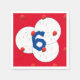 Design apresenta imagens padronizadas de balões e confetti contra formas circulares brancas que são exibidas contra um fundo vermelho. A idade da criança é ilustrada em azul brilhante no centro da design.