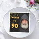 Um guardanapo para a festa de aniversário de 90 do cara. Modelo para sua foto. Fundo preto e o tex: Anima-se a 90. O texto é escrito com um guião de balão de ouro falso de tendência. Com ouro confetti como decoração.