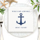 Guardanapos de papel náutico moderno com uma âncora azul marinho e o ditado "Bem-vindo a bordo". A modelo facilita a personalização com o nome do barco.