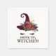 Os guardanapos ideais para a sua festa de Halloween ou despedida de solteira com tema de Halloween. Apresenta uma carinha de bruxa fofa (um chapéu de bruxa de veludo vermelho burgundy com um buquê de rosas vermelhas e folhas de carvalho pretas sobre um par de cílios pretos descansados). Abaixo, o texto preto lê "Beba, bruxas!" em uma fonte adequadamente assustadora.
