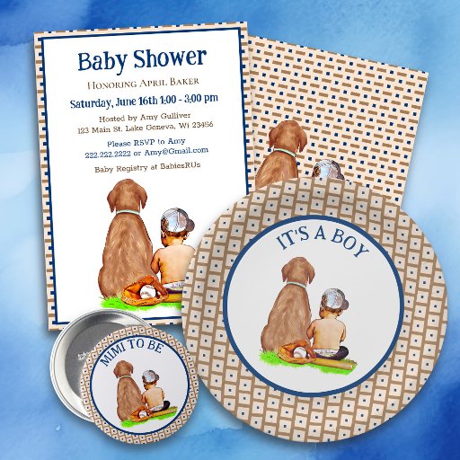 O Brown e o Blue personalizaram guardanapos de chá de fraldas do menino com um bebê sentado ao lado de um cachorro com um tema de beisebol.