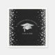 This modern design features a graduation hat and confetti in silver on a background of black with white text.