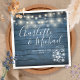 Apresentando nomes de estilo de na moda, esses elegantes guardanapos rústicos podem ser personalizados com suas informações em letras brancas chic sobre o fundo de painéis de madeira azul com luzes de cordas e frascos-pedras. Projetado por Thisnotme©