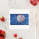 A colorful aerostatic hot air balloon seen from below sits against a deep blue, starry background. The design is vibrant with red, white, and blue segments, surrounded by scattered small yellow and white accents.