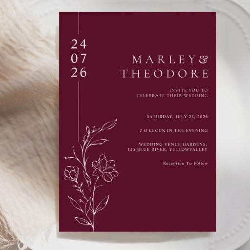 This stylish wedding napkin features boho floral line art on a crisp white background. The deep burgundy typography adds a modern and elegant touch. The simple layout brings a refined look to your table settings.