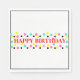 Feliz aniversário está escrito em texto vermelho. Bolinhas divertidas em bolinhas azul-turquesa, rosa, amarela e preta. Uma borda quadrada preta traça os guardanapos do partido em um fundo branco. Padrão geométrico para celebrar qualquer idade. Designs originais © TamiraZDesign.