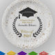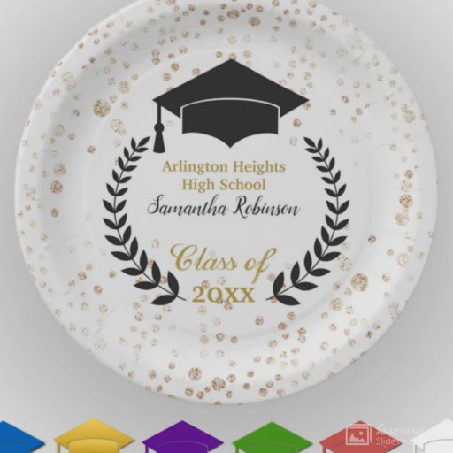 Resguardas de papel para o segundo grau ou festa de formandos especial com texto personalizado. Apresenta a imagem de um boné de formando preto e uma coroa de louros acentuada com um faux gold confetti. Chapa de papel correspondente, também vermelha, azul e outros grupos de cores também disponíveis neste mesmo design