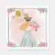 Este design de guardanapo apresenta uma pintura aquarela de uma menina de cabelo castanho com um vestido azul e um boné de formatura segurando balões, flores e seu diploma rolou. A borda apresenta um quadro azul com flores coordenadas em cada canto
