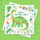Este design de aniversário conjunto de dinossauros apresenta um brontossauro de pescoço longo, verde e laranja, cercado por folhagem e galhos. Todas as ilustrações são pintadas manualmente em giz d'água. Este design tem espaço para dois nomes para uma comemoração de aniversário combinada ou você pode editá-lo para um nome de solteiro. Veja toda a coleção correspondente.