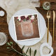 Estes guardanapos de papel floral rústico apresentam um buquê de burgundy e flores escamoteadas em cima de um jarro de pedras com os nomes da noiva e do noivo e a data do casamento. As luzes de cordas decoram o topo do design, com um fundo de madeira rústica castanho-escuro.