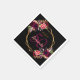 Um guardanapo para a 50ª festa de aniversário. Um fundo preto chic com uma falsa estrutura geométrica dourada. Decorados com flores roxas escuras e burgueiras, rosas e penas do estilo "boho". Modelos para nome, idade e data. Data de nascimento ou data da festa. O nome é escrito com um script de estilo manuscrito, letras cor-de-rosa, 50 anos em roxo e a data com números de ouro.