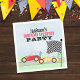 Este divertido convite para o aniversário do carro de corrida apresenta os guardanapos de aniversário de criança de aniversário para crianças, bonitinhos de animação para crianças, modernas celebrações minimalistas, tipografia vintage branca clássica, guardanapos de aniversário com marca registrada, mantimentos de festa de aniversário para crianças, com esportes de corrida legal, carros de corrida retro papel, um gráfico derby colorido, para uma celebração de aniversário de criança