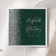 A borda esquerda desses elegantes guardanapos de casamento modernos apresenta um design de cintilação de prata. O texto personalizável combina a escrita manual de cinzas prateadas e as fontes de impressão sobre um grande painel e sobre um fundo verde escuro.
