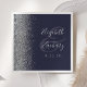 A borda esquerda desses elegantes guardanapos de casamento modernos apresenta um design de cintilação de prata. O texto personalizável combina a escrita manual de cinzas prateadas e as fontes de impressão sobre um grande painel e sobre um fundo azul marinho escuro.