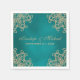 Uma bela carta verde-azul-lacrimogênea e de mesa de núpcias de ouro com um medalhão de sari ornamental inspirado por índios exótico, como um padrão com um design floral e lotus. Este elegante e belo guardanapo de papel ao estilo indiano é perfeito para qualquer ocasião formal ou especial com um tema indonésio de leste asiático ou marroquino ou árabe Noites. © Chrissy H. Studios, LLC. Todos os Direitos Reservados.