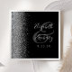A borda esquerda desses elegantes guardanapos de casamento modernos apresenta um design de cintilação de prata. O texto personalizável combina a escrita manual de cinzas prateadas e as fontes de impressão em um grande painel e em um fundo preto.