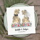 Perfeito para um casamento temático de dinossauros, esta noiva de dinossauros divertida e noiva em guardanapo de flores silvestres coloridas vai deliciar seus convidados. Fácil de personalizar com os nomes da noiva e do noivo e a data do casamento no moderno roteiro de tipografia. Engraçado dino T-Rex dino noiva e noiva e noiva e cor d'água ilustrações florais de verão em tons roxos, cor-de-rosa, verde e laranja. Dino original único e trabalho de arte floral de verão da artista Catherine Sweetman