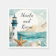 Bonitos guardanapos de casamento com um farol preto e branco náutico, estrelas-do-mar e conchas. Perfeito para um casamento. As palavras podem ser alteradas para se adequarem aos seus próprios detalhes ou requisitos