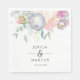 Bonitos guardanapos de casamento com flores aquáticas e folhas em azul, rosa e verde empoeirado. Seus nomes, grandes e grandes nomes no centro, e sua data de casamento, estão em cinzas escuras. Itens correspondentes estão disponíveis.