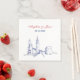 A mão elegante ilustrou o desenho de Londres em combinação de cor da bandeira da Inglaterra: fundo azul, vermelho e branco puro. Simples, guardanapos de papel, com nomes personalizados de noiva e noiva e data de casamento. Escolha perfeita para casamentos com flare pessoal.