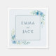 Aumente sua celebração com este elegante guardanapo de casamento, lindamente adorado com flores românticas de aquarela em delicadas tonalidades azuis e verde macio. A paleta de cor suave e o quadro botânico pastel rodeiam graciosamente os nomes da noiva e do noivo, mostrados em uma fonte serif clássica para um toque refinado de vintage. Perfeito para uma festa elegante ou decoração de mesa de jardim, este guardanapo floral azul dobra como uma encantadora lembrança ou um pensativo momento de casamento de outono. Sua combinação de estilo refinado e detalhes personalizados garante que sua mesa de casamento se sinta sofisticada e convidativa para cada convidado.