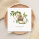 Este guardanapo de casamento de palmeira tropical é um design de selva tropical com as cores da natureza. Ele apresenta palmeiras, florestas tropicais exuberantes e bangalôs aninhados em um belo cenário de paraíso tropical.
