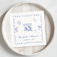 Os guardanapos de casamento retrógrados para a sua festa de noivado, janto de ensaio, recepção de casamento, etc., com uma moldura azul francesa adornada com arcos coquetes, ilustrações desenhadas à mão branca de um coração, estrelas e óculos de vinho, e os nomes da noiva e do noivo em um roteiro azul lúdico.