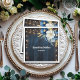 Uma elegante design de Casamento com elegante caligrafia completada por maravilhosas madeiras azuis, luzes de cordas de jardim e floral azul branco com brilho dourado. Você pode personalizar isso com seus detalhes.