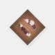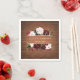 Este design de guardanapo de papel de boho apresenta madeira burgundy com cor d'água e arranjos florais para escamotear os nomes da noiva e do noivo e a data do casamento, com um fundo de madeira marrom-escuro rústico.
