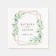 Elegante moldura geométrica dourada adornada com folhagem em aquarela, guardanapos de papel personalizados. O design apresenta linhas de texto modelo para nomes e data.