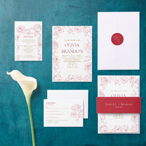 Um desenho vermelho de peônia faz uma declaração elegante para o seu casamento. Você pode personalizar com suas informações e mudar a cor para se adequar ao seu evento.