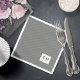 Uma fonte ousada e decorativa imediatamente pega seu olho e define o tom para a maioria das peças desta suíte de casamento moderna e minimalista. O guardanapo de papel de casamento mostrado aqui apresenta um pano de fundo opcional, diagonal para suas iniciais e data de casamento. Um amberer acentuado no coração e adiciona um toque único de acabamento. Procure ID887 para ver todos os produtos neste conjunto de casamento.