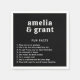 Os guardanapos de casamento ao estilo moderno, com um esquema simples e mínimo com os seus nomes numa fonte retrógrada e uma lista de fatos divertidos sobre a noiva e o noivo. O esquema de cores é preto com letras brancas. As fontes/cores podem ser alteradas na ferramenta de edição de design. Estes fatos divertidos guardanapos adicionam um elemento divertido à sua recepção de casamento, festa de noivado ou chá de panela.