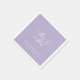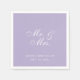 Guardanapos de casamento para um casamento com cor de casamento lavanda. Apenas texto branco em fundo roxo lavanda. As palavras "Sr. & Sra." são escritas em um script caligráfico elegante, os nomes da noiva e do noivo e a data em letras maiúsculas menores.
