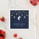 Guardanapo de casamento celestial. Céu azul de água com estrelas e a lua. Luzes de cordas.