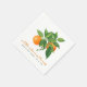 Apenas um ramo de citrino com folhas verdes e duas laranjas. Com o título do tema, "um pequeno doce a caminho", sob o ramo, em uma fonte sofisticada laranja, e o nome e ocasião e a data abaixo disso, em letras maiúsculas pretas pequenas.
