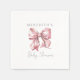 Um design charmoso de guardanapo de coquetel com um grande laço de água-furtada rosa no centro. O nome da futura mamãe é exibido acima do laço em uma fonte serifada clássica, com "Baby Shower" escrito elegantemente abaixo em escrita à mão.
