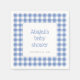 Um padrão clássico de verificação de gingham azul enquadra um retângulo branco com cantos arredondados e uma fina borda azul, com o nome da futura mãe e as palavras "chá de fraldas" na charmosa tipografia azul. Adicione a data abaixo na fonte de sans da cinza. Ideal para o chá de fraldas de um menino.