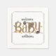 Os guardanapos chás de fraldas com ilustração de uma raposa, coruja, ursinho e guaxinim que se baseiam no texto "BABY". Personalize o nome.